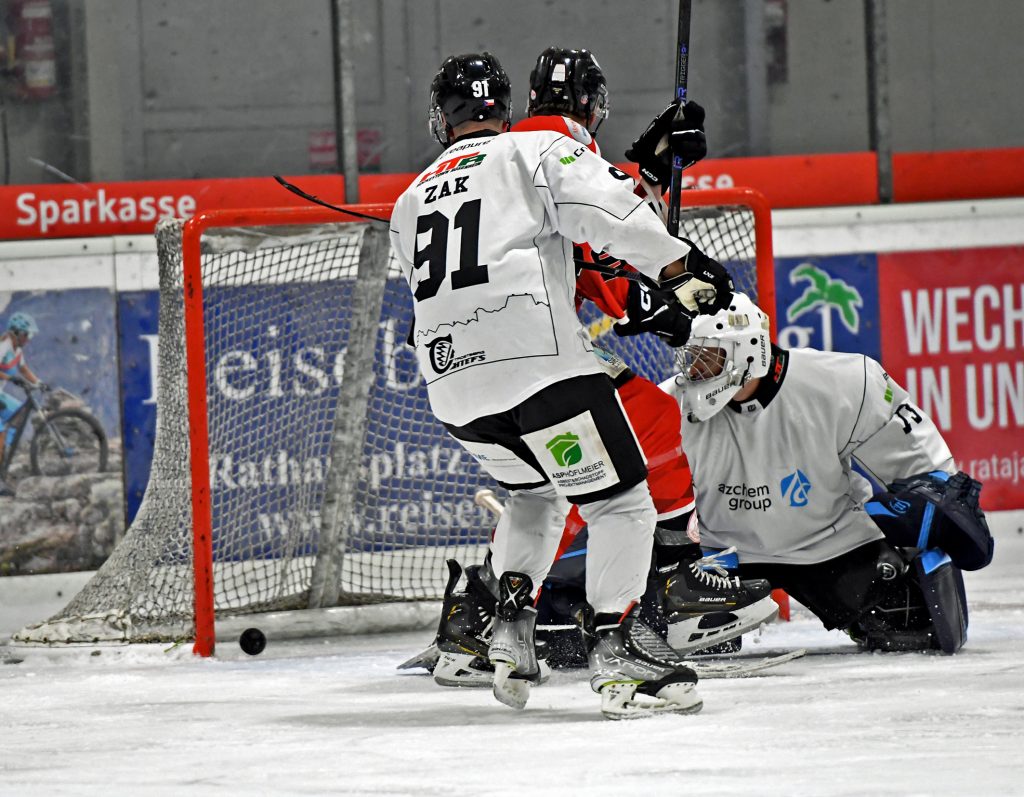 Gehörig ins Schleudern gebracht haben die ESV-Stürmer um Philipp Pfahler im Hinspiel Johannes Pfafferott im Tor des EV Aich!