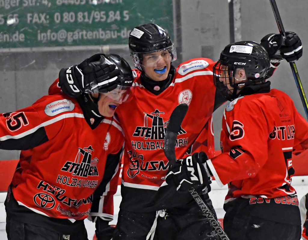 Ansatzlos abgezogen hat Matthias Selmair (rechts) zum 8:2 und letzten ESV-Treffer des Abends – der zweifache Torschütze Christian Göttlicher feiert mit!