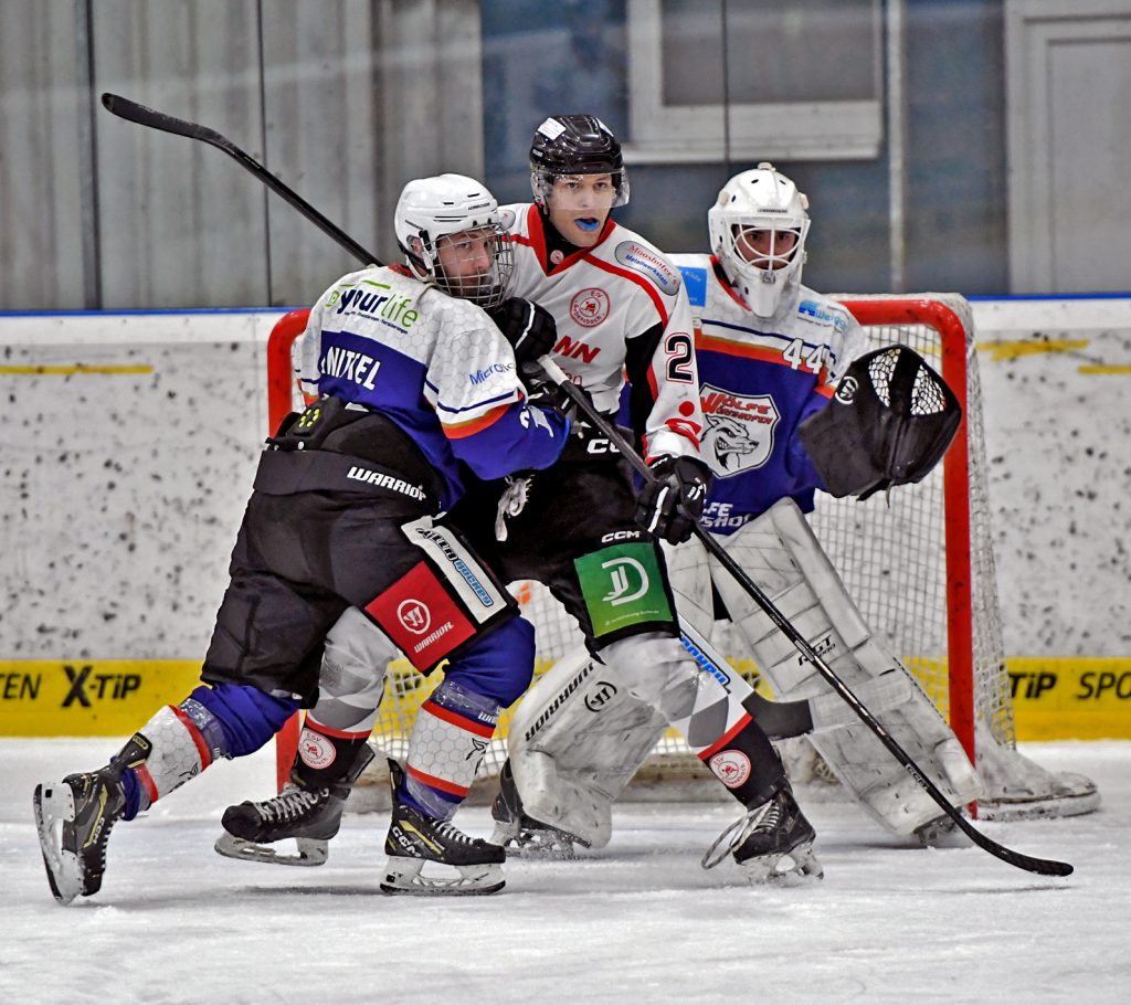 Treffer zum 3-0 – Dominik Taras (ESV, re.) gegen Goalie Timo Greimel, Alex Imolek (li.) u. Sebastian Weiß (Wkbg 1b) Foto: Dominik Findelsberger