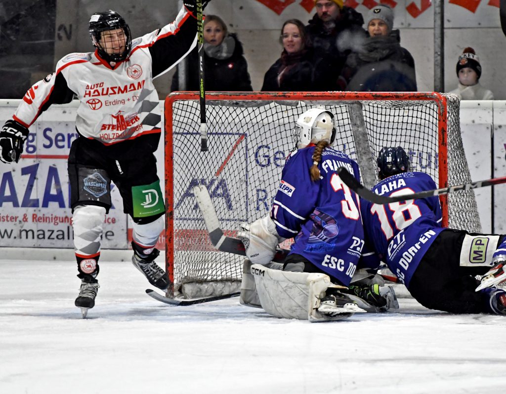 Lukas Piller (ESV, li.) traf zum 6:2 gegen ESC-Goalie Lina Brandstätter Foto: Dominik Findelsberger