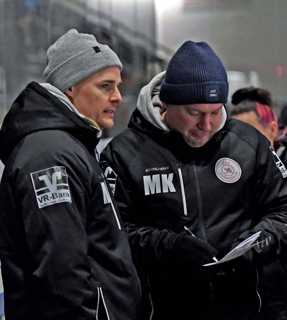 Aich vor der Brust, die Playoffs im Visier – ESV-Trainer Manuel Bertl (li.) und sein Sportlicher Leiter Mike Krähmüller. Foto: Dominik Findelsberger