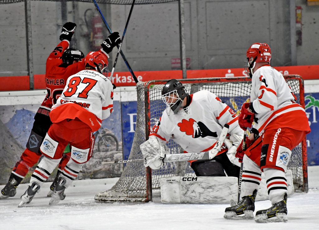 Treffer zum 1-1 – Christoph Pfahler (ESV, li.) jubelt gegen Goalie Johannes Probst (Aich), Teo Herpich (li.) u. Danny Weber (re.) Foto: Dominik Findelsberger